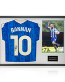 Wooden framed SWFC display containing an etched plaque and a shirt signed by midfielder Barry Bannan. After joining The Owls in 2015 Bannan was made captain at the start of the 2020/2021 season and continues to be one of the sides top players. This is a pre-order item with delivery at mid February. This shirt has Fan Style Numbers.