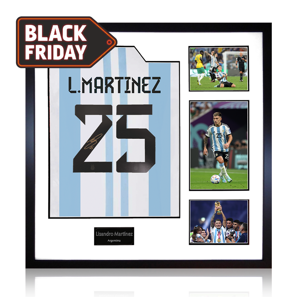 Beautifully presented Elite Frame with signed Argentina shirt from Lisandro Martínez. This item was signed at an exclusive Fan Cave signing with Lisandro. The frame measures approximately 820mm x 820mm. This item is accompanied...