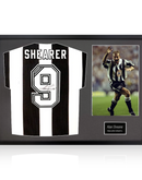 Retro Newcastle United football shirt display. This full shirt in a wooden frame has been signed by Newcastle United Legend; Alan Shearer. This presentation includes a custom plaque and two iconic photos.