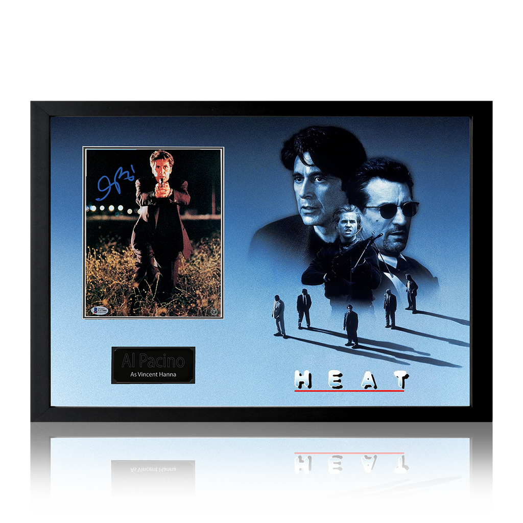 Wonderfully presented framed display of Al Pacino as Vincent Hanna in the 1995 film "Heat". This display containing a signed photo of Al Pacino, has been mounted in a print of the poster from the movie and would make a great ad...