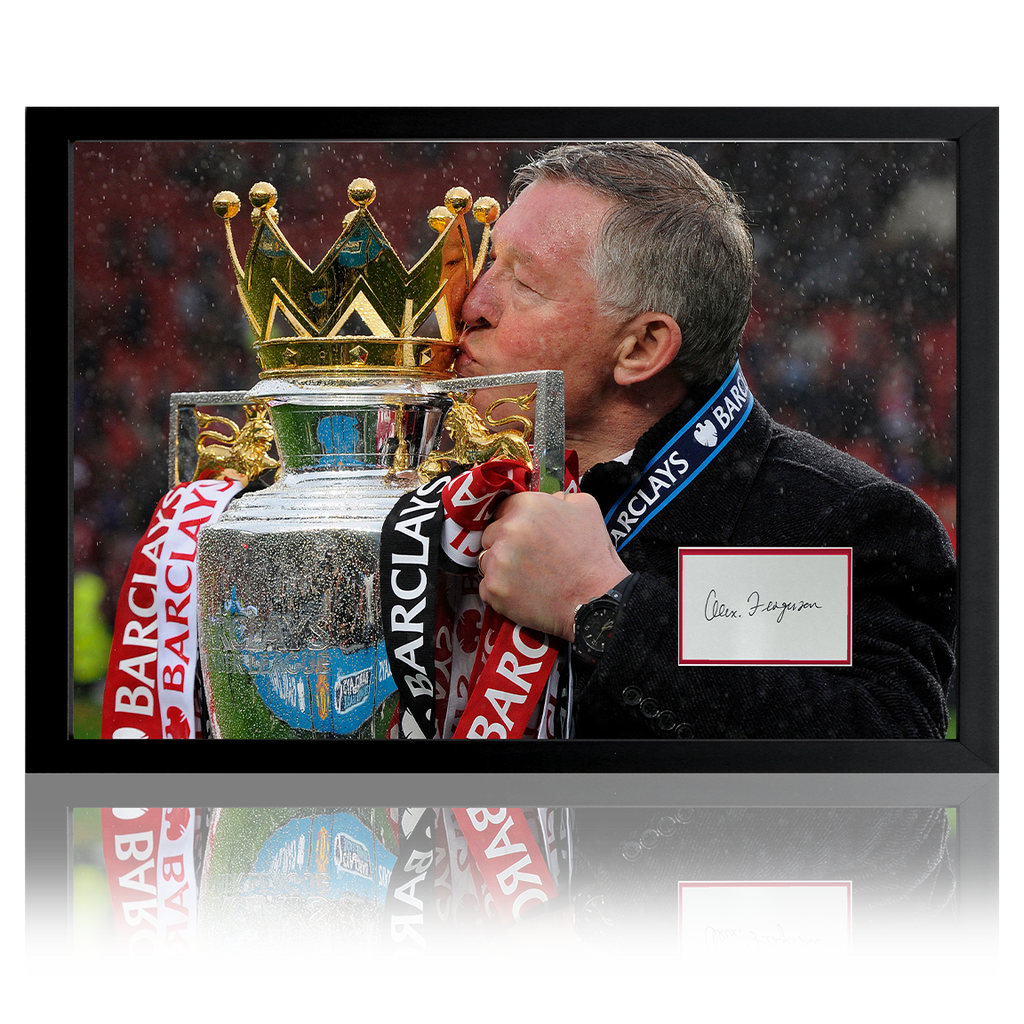 Wooden framed poster mount display containing a signed card from football managing legend Sir Alex Ferguson. As manager of Manchester United he won 13 Premier League titles, 5 FA Cups and 2 Champions League titles over a 26 yea...