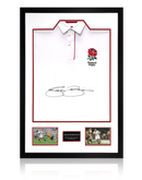 Wood framed rugby shirt display signed by 2003 World Cup Winner and former Captain; Jason Robinson. This presentation also includes an etched plaque and 2 iconic photos from his England playing career