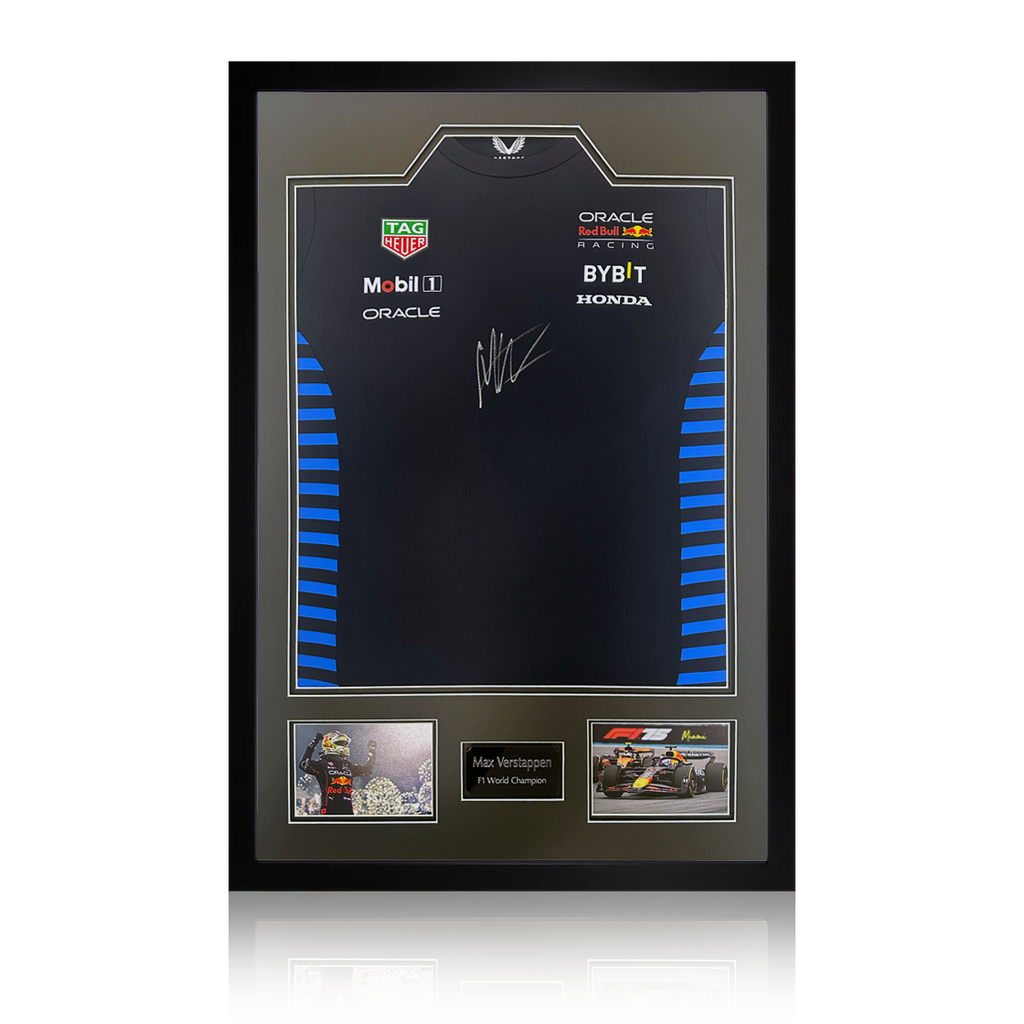 Framed official Max V Red Bull Racing shirt signed by current Formula One world Drivers Champion; Max Verstappen. This would make a fantastic addition to any motorsport collection. This item measures approximately 850mm x 600mm...