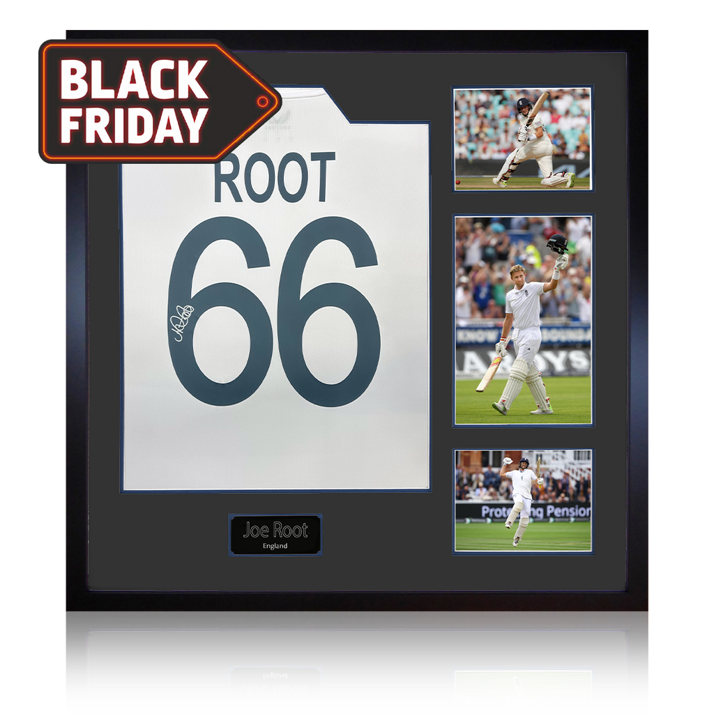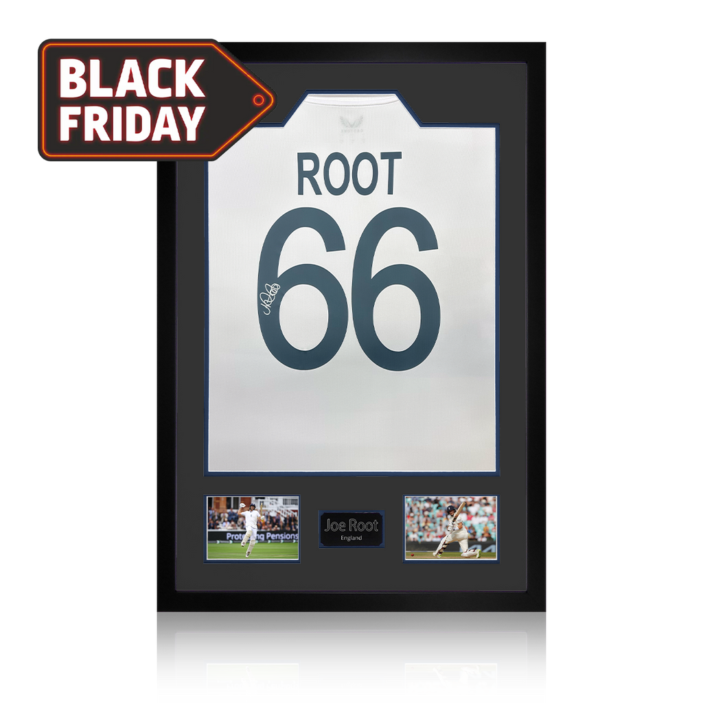 Framed England Test Shirt display with a custom engraved plaque, three photos & black top mount. Contains a shirt signed by England cricket legend, Joe Root. This would make a great addition to any cricket collection. This ...