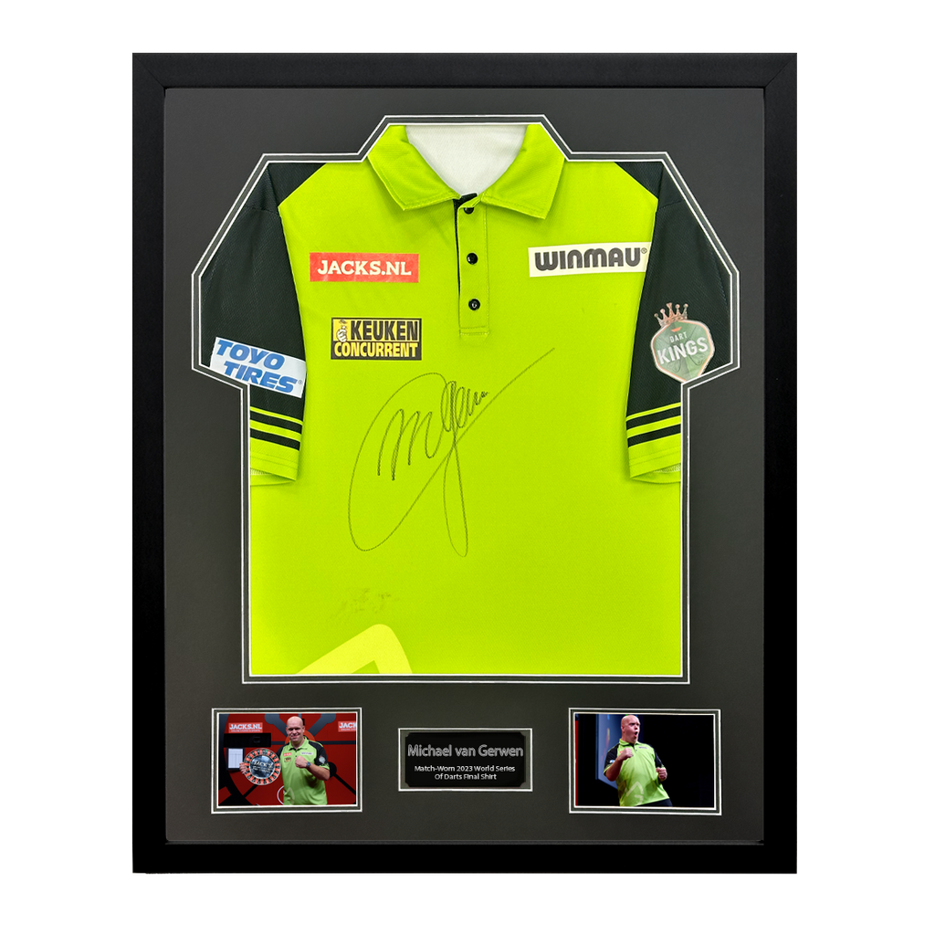 A signed and match-worn MVG shirt in a Elite Frame. The shirt is from 2023 World Series Of Darts final.