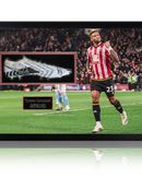 Sheffield United display with a signed match-worn boot by Tyrese Campbell. The United forward's boot is from the 24/25 season against Coventry City at Home. This is the left boot. This item measures approximately 690mm x 480mm. This item is accompanied with an certificate of authenticity from The Fan Cave.