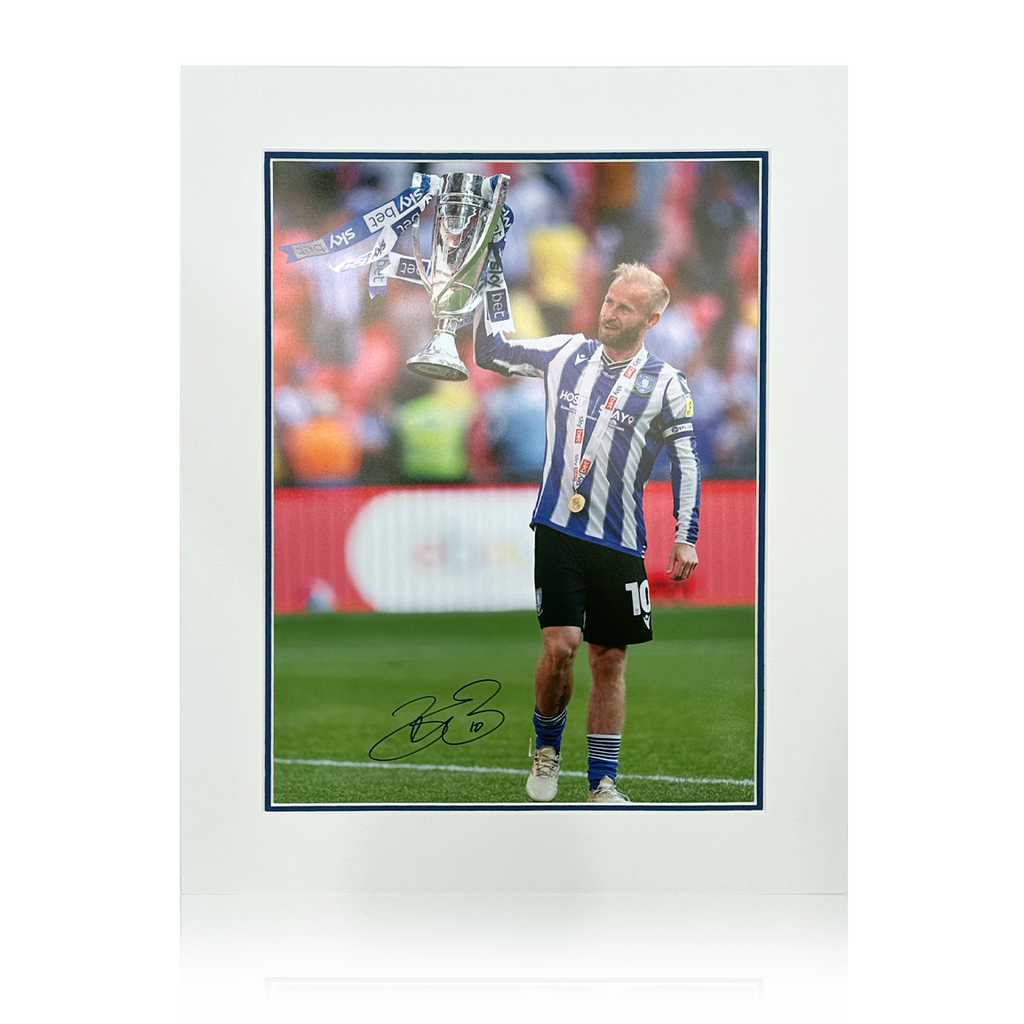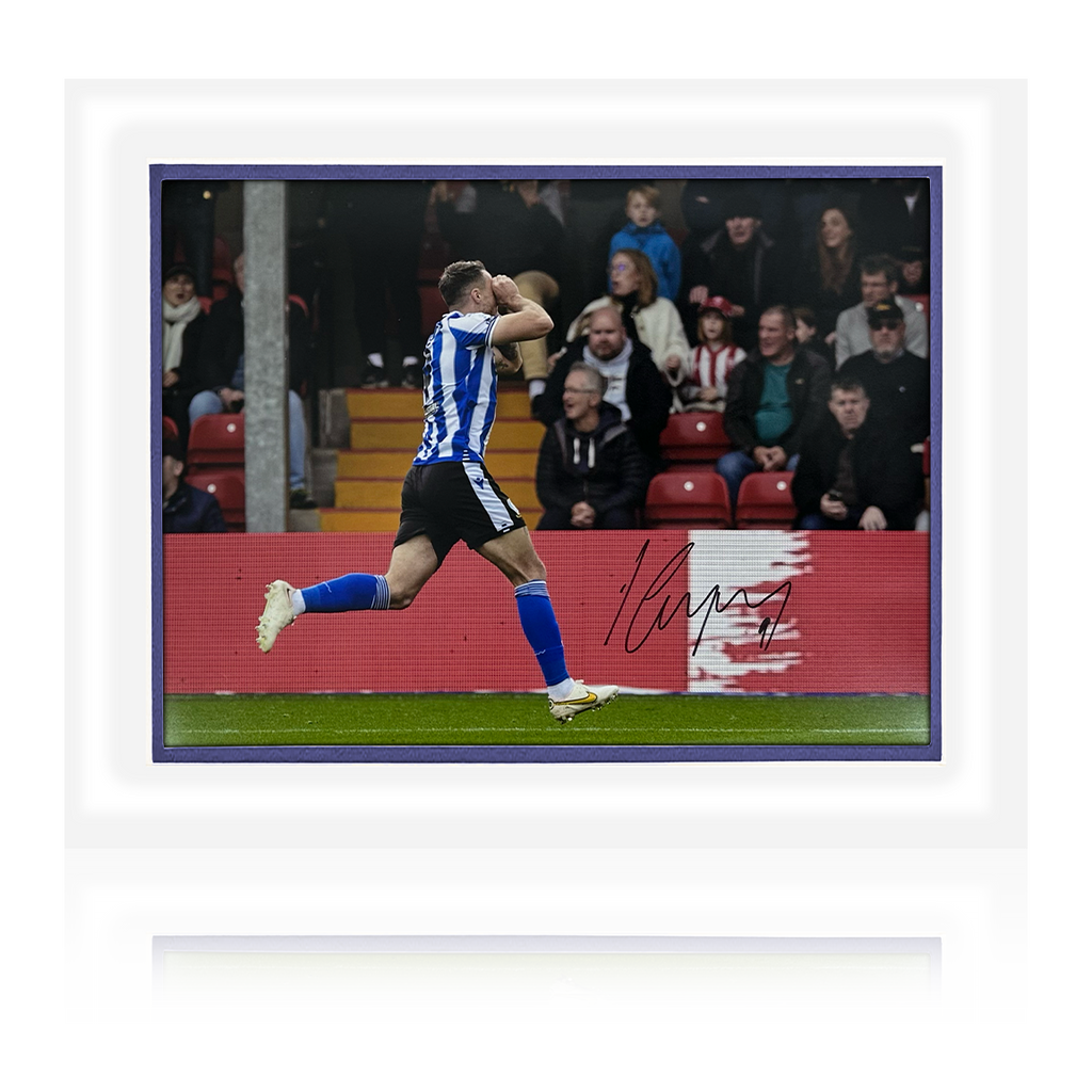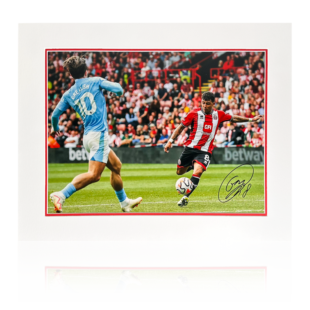 Signed mounted photo of striker Oli McBurnie. These mounts are designed to fit an off the shelf size frame and make a great addition to any collection. Signed as part of a private signing with The Fan Cave in 2023!